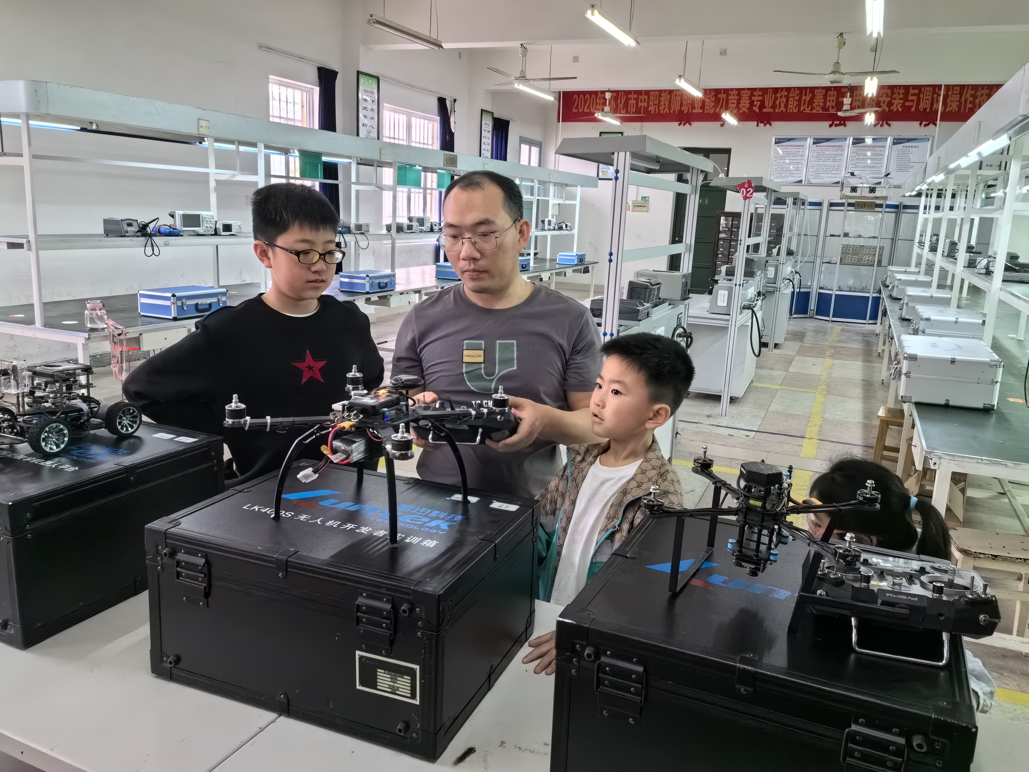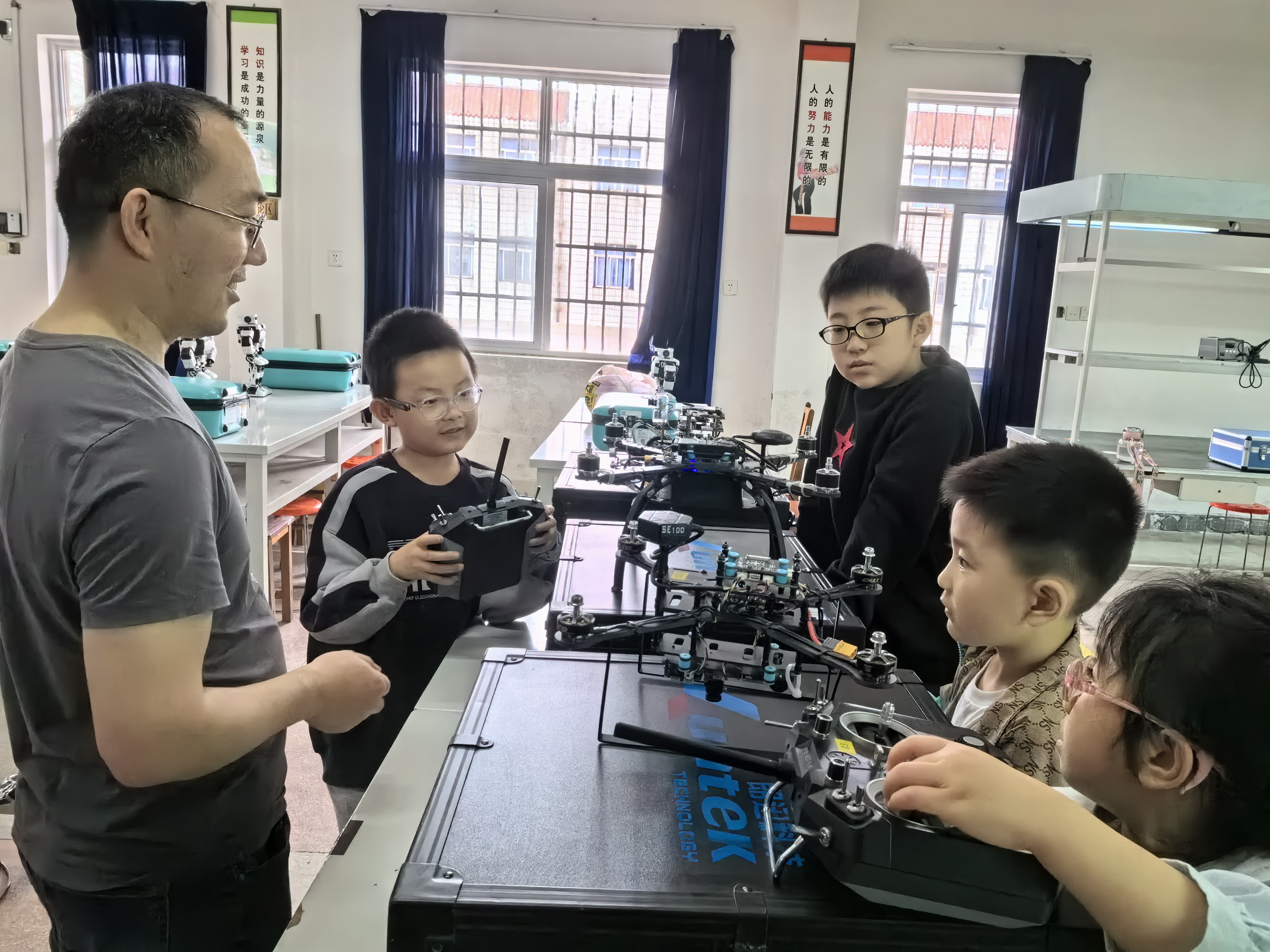 孩子们在老师的指导下操作无人机