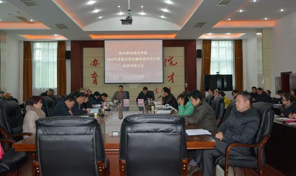 上午,检查考核组成员查阅了相关资料,进行了实地考察,并组织了个别谈话。下午在多功能厅,举行了怀化职业技术学院2015年度落实党风廉政建设责任制检查考核大会。院党委副书记、院长王聪田代表院党委汇报了我院2015年履行党风廉政建设主体责任工作情况,院纪委书记冯秀金代表院纪委汇报了我院2015年履行党风廉政建设监督责任工作情况。