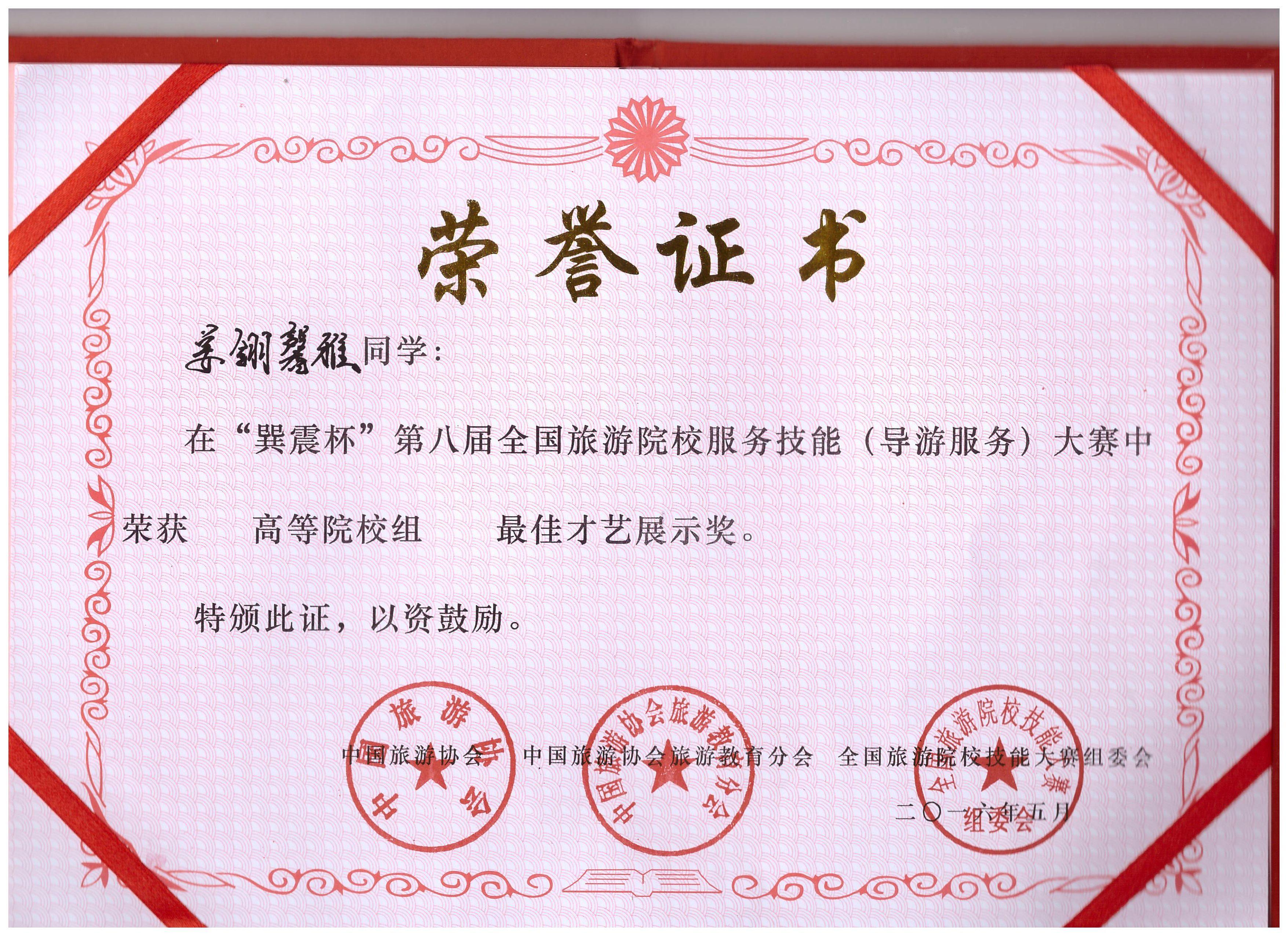 “导游服务”赛项分普通话导游服务和英语导游服务两个赛项。每个赛项分别包括自选导游讲解、抽选专题讲解、导游理论知识测试和才艺展示等四项内容。我院选送的14级旅游管理专业的学生姜翎馨雅(李玉华老师指导)凭借自己精彩的表现,经过激烈的角逐,获得全国职业院校中文导游服务技能比赛 “优胜奖”和最佳才艺展示奖,14级旅游管理专业的学生熊浣菁(刘慧老师指导)获英文导游服务技能比赛 “优胜奖”。这是今年我院旅游管理专业继参加湖南省职业技能赛获英文导游服务三等奖后再次获得专业技能大赛奖。