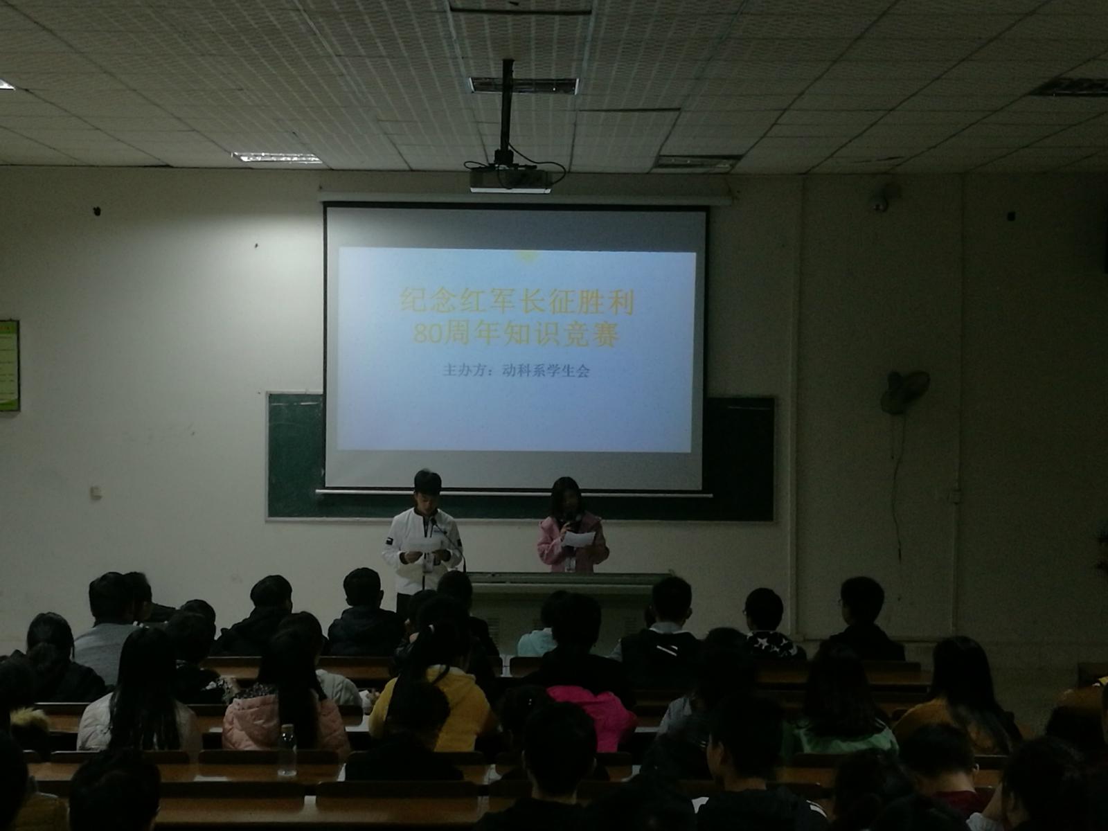 动物科技系别出心裁,把红军长征行走过的地方用抢答的方式进行知识竞赛,大大调动了学生的积极性。