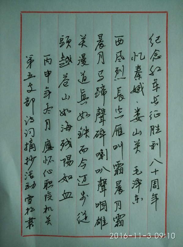 第五党支部以不限形式,不限字体的书写方式,开展“纪念红军长征胜利80周年”诗词书写征集活动,党员干部踊跃参与,征集到了许多手抄的硬笔书法作品。如《七律·长征》、《沁园春·雪》《红一方面军长征记》、《纪念红军长征胜利八十周年》、《忆秦娥·娄山关》。行云流水的诗词,刚劲有力的书法,将我院党员干部的文人风骨展现的淋漓尽致。