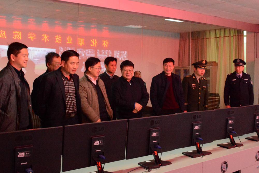 朱副市长一行人首先参观了我院的应急指挥中心。应急指挥中心投入203万元在20161月份建成并投入使用,设有一个总监控室和五个子监控室,两个360度全院覆盖激光云台, 265个机枪监控器遍布教学楼和实训室,宿舍楼和办公楼等地还装有138个半球机,实现了校园安全监控全覆盖,技术水平处于省内先进水平。朱副市长参观后表示,安全面前无小事,居安思危不懈怠,要扎实推进安全防范措施。