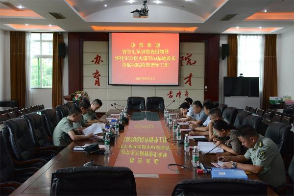 922日,省学生军训督查考评组第三组副组长、省学生军训办参谋丁行行、省军区综合训练队教员任超、怀化军分区战备建设处参谋杨帅、火箭军63基地参谋部部队管理处参谋陶园一行来我院督查考核2017级新生军训工作。